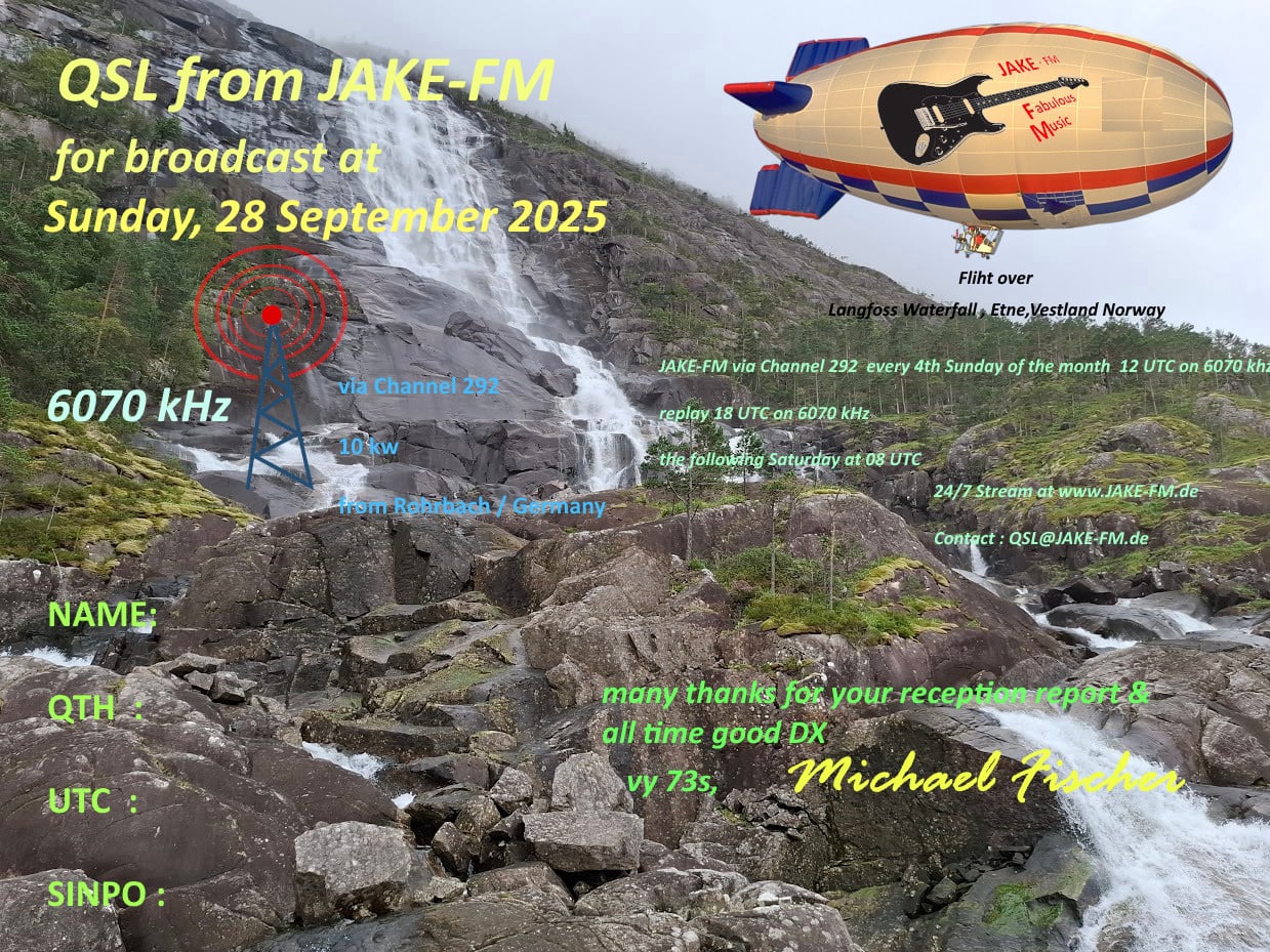 Ab 14 Uhr Ortszeit auf der Frequenz 6070 kHz mit der "JAKE-FM - Kurzwellenshow" .